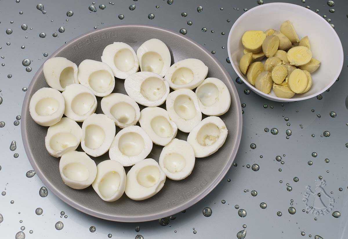 Важно! Чтобы эта закуска получилась не только вкусной, но и аппетитной на вид, нужно как можно аккуратнее очистить готовые яйца от скорлупы. К сожалению, такой простой на первый взгляд процесс далеко не всегда проходит успешно и иногда существенная часть белка остается на скорлупе, что делает яйца немного облезлыми на вид