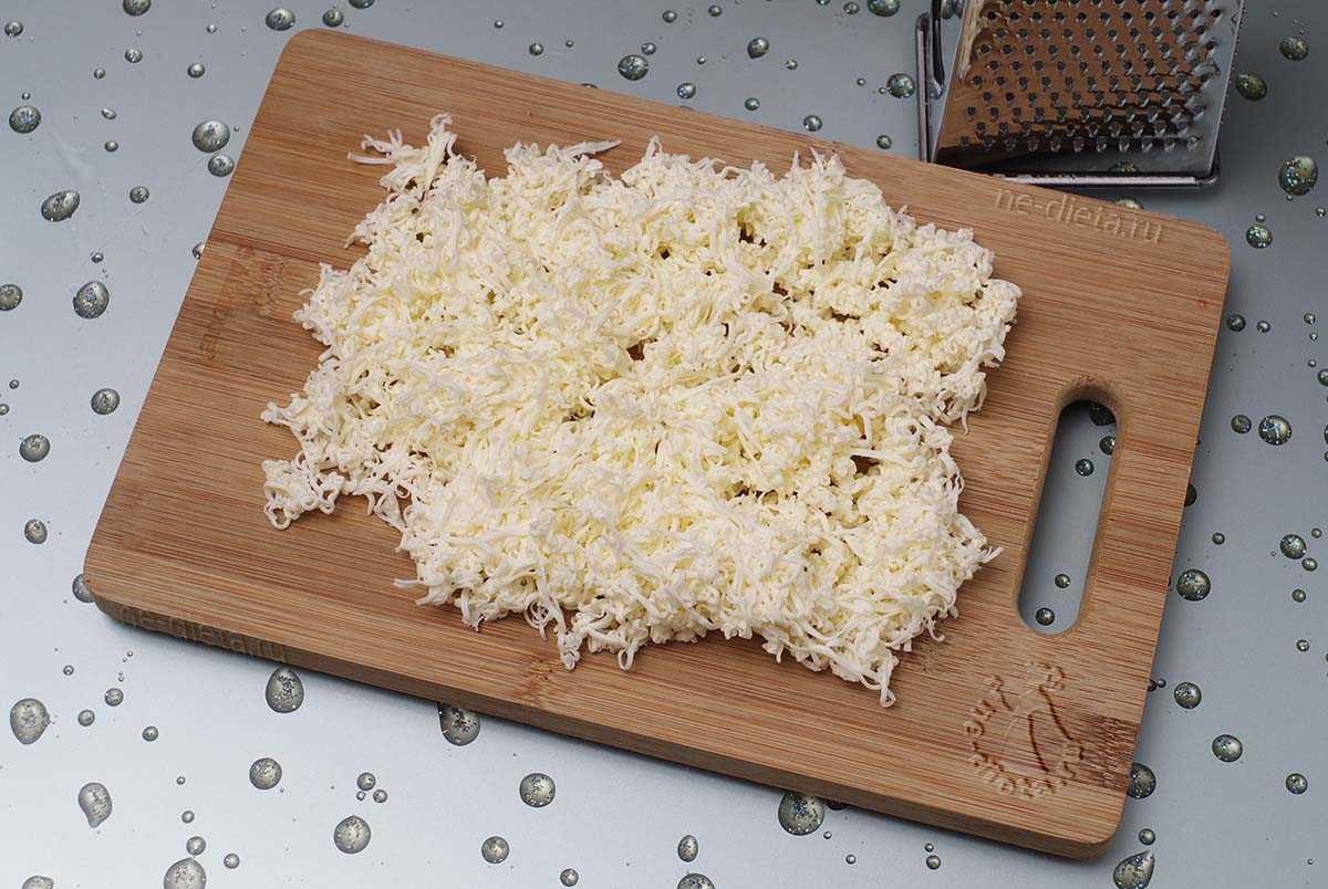 5. Плавленые сырки натереть на мелкой терке. Чтобы они при этом не расползались, их можно предварительно подержать в морозилке в течение 15 – 20 минут.