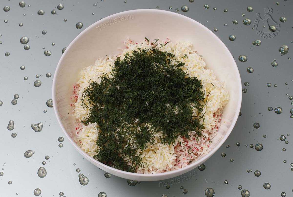 Все готовые ингредиенты сложить в одну миску, сдобрить майонезом и перемешать. После порубить укроп и добавить в основную массу. Он придаст нашей закуски отменный аромат.