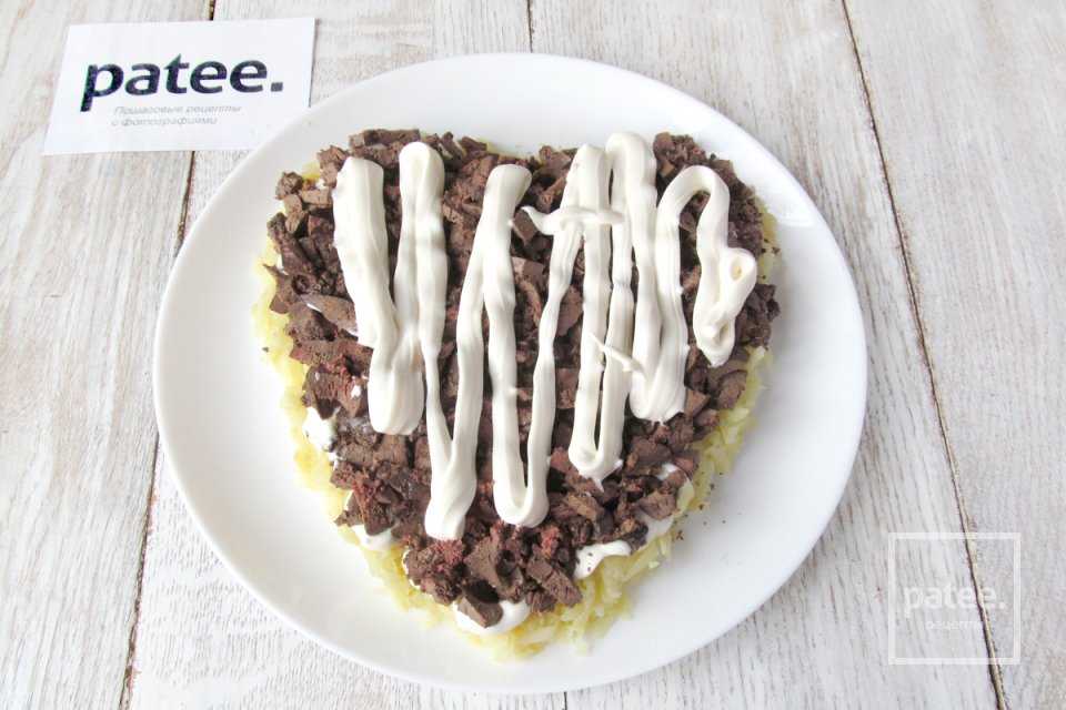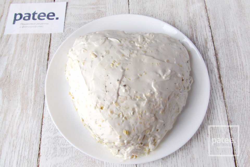 Теперь салат щедро смазываем майонезом со всех сторон и придаём ему аккуратную форму, разравнивая майонез ножом.