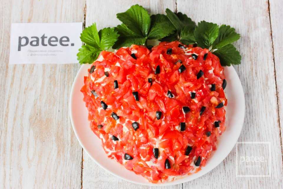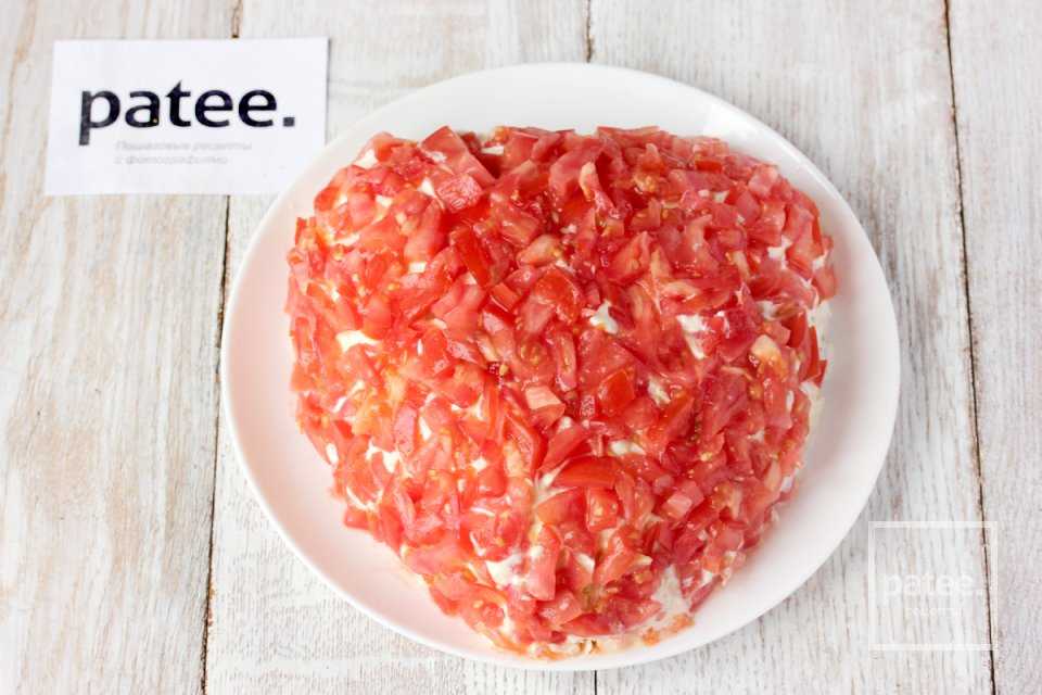 Салат, поверхность и бока, покрываем помидорами, слегка вдавливая их в майонезный слой.