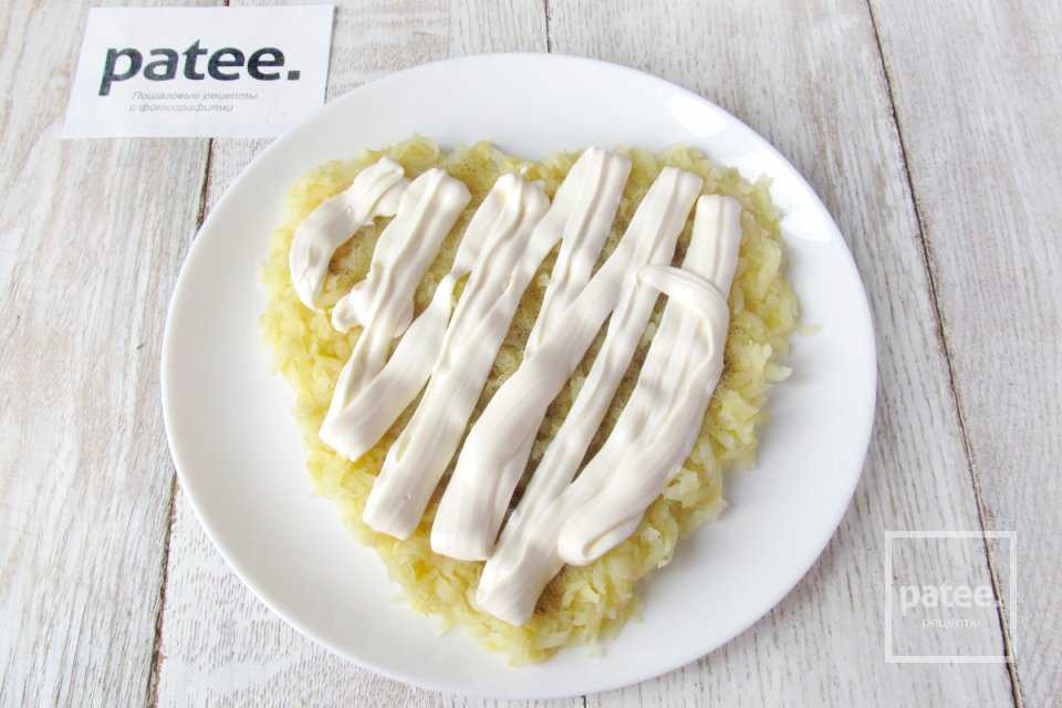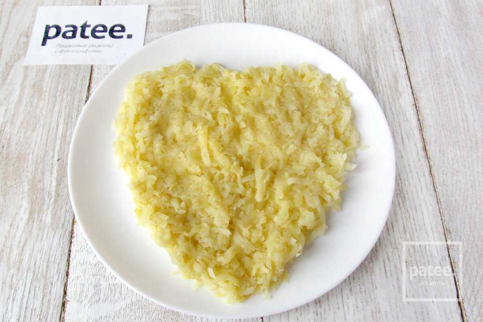 На дно широкой плоской круглой тарелки выкладываем первым слоем натёртый картофель, имитируя форму клубничной ягодки.