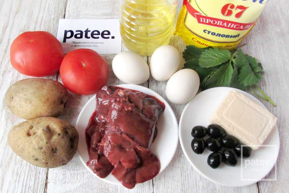 Для приготовления салата нам понадобится отваренный картофель “в мундирах”, отваренные вкрутую куриные яйца, помидоры, куриная печень, маслины без косточек, фиолетовый лук, плавленый сыр, подсолнечное рафинированное масло, майонез, соль, чёрный молотый перец и листья клубники для украшения.