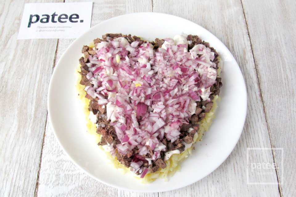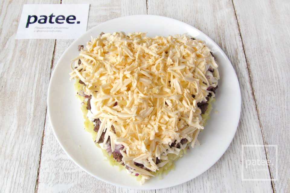 Луковый слой слегка поливаем майонезом и выкладываем натёртый плавленный сыр.