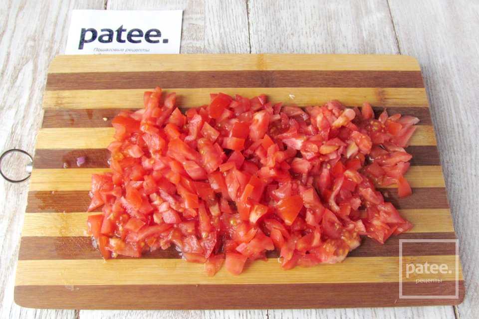 Помидоры моем, насухо вытираем, вырезаем плодоножку и мякоть измельчаем. Выделяющийся сок при этом необходимо сливать.