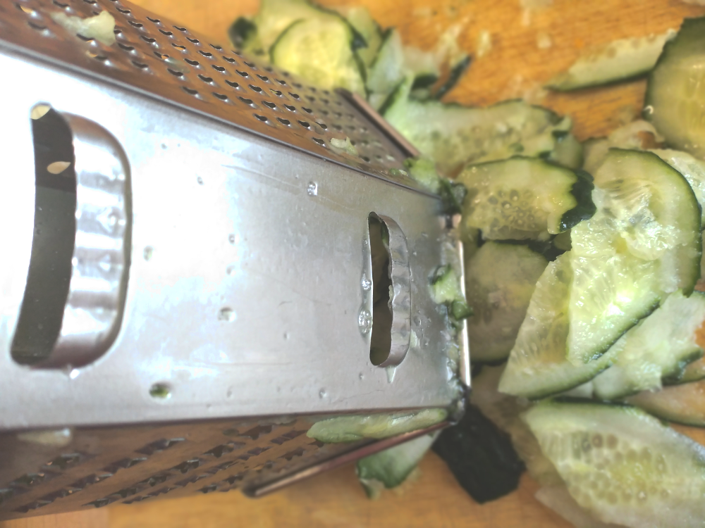 3. Огурцы для этого салата нужно натереть на специальной терке (см. фото) или нарезать тонкими полосочками.