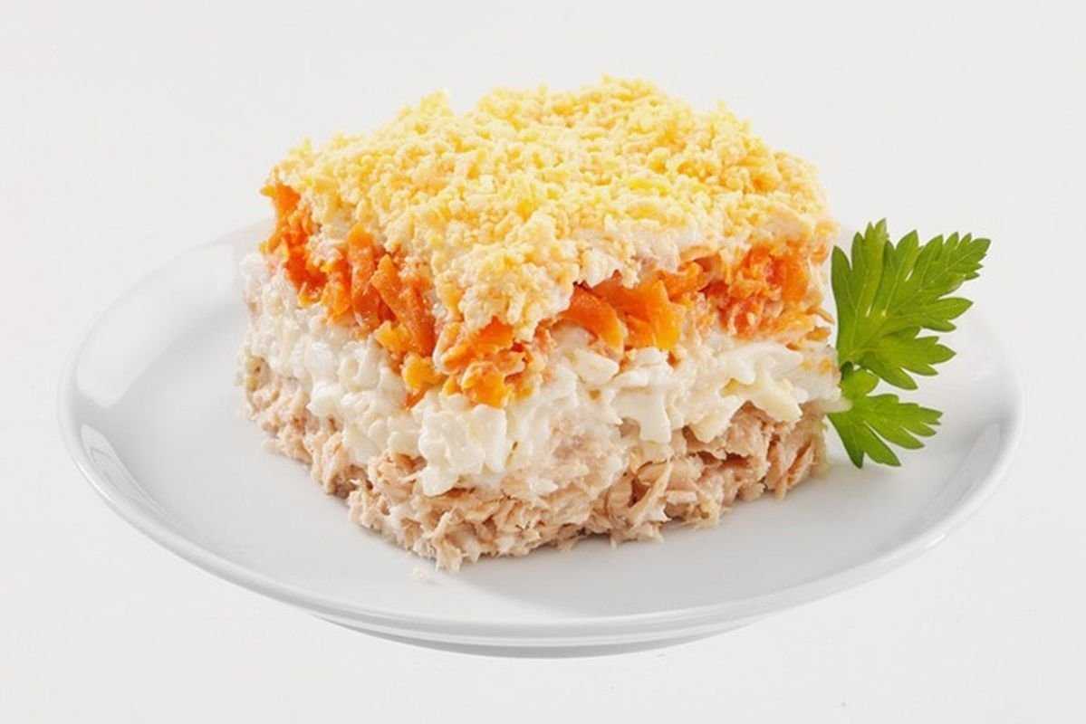 6. Аккуратно, не приминая, разравнивая легкими движениями вилки (чтобы салат получился воздушным), выложить на блюдо слоями в следующем порядке: 1-1/2 рыбы, 2-1/2 лука, 3 — белок, 4 — йогуртовый соус, 5-1/2 рыбы, 6-1/2 лука, 7 — сыр, 8 — йогуртовый соус, 9 — желток. Как показано на фото, салат для похудения сверху можно украсить зеленью.