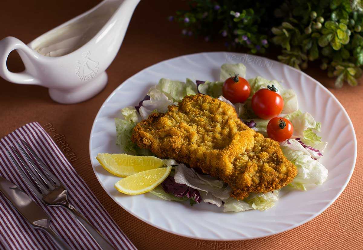 - Многие шефы рекомендуют после панировки дать мясу «отдохнуть» часок в холодильнике – полежать требуется, чтобы «шубка» как следует взялась и не отстала в процессе жарки от самого шницеля.