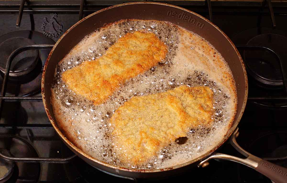 - По истечении 10 — 15 минут разогреваем на сковороде с толстым дном смесь растительного и сливочного масел. Шницели обваливаем изначально в муке, затем во взбитых яйцах, следом в сыре и наконец, в панировочных сухарях. Затем выкладываем на разогретую до кипения смесь из масел.