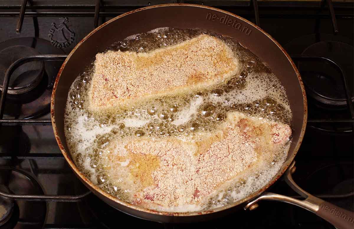 Обвалять кусочек в панировке можно заранее, но в этом случае сухари пропитаются мясным соком, станут мягкими, а после обжарки не будут хрустеть.