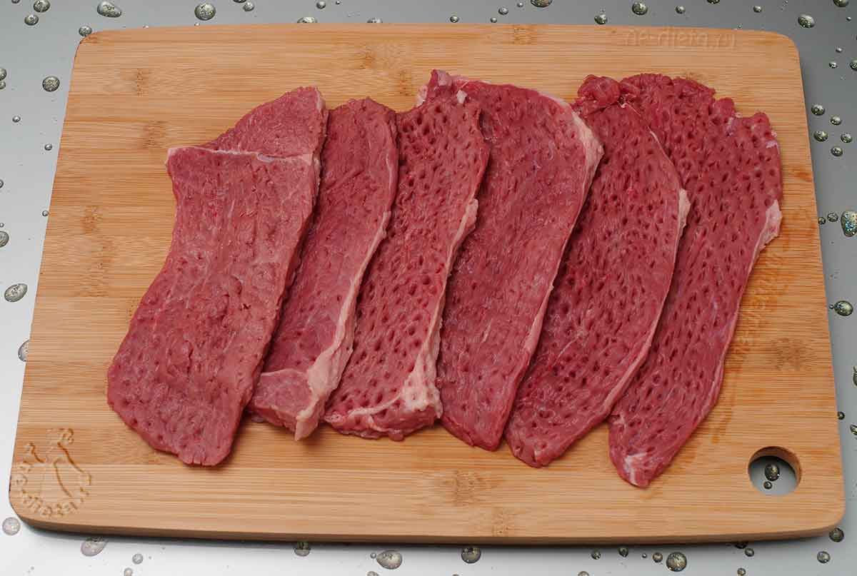 - Мяско нарезаем на стейки, затем на каждом из них делаем надрез вдоль. Должны получиться заготовки, похожие на открытые книжечки;