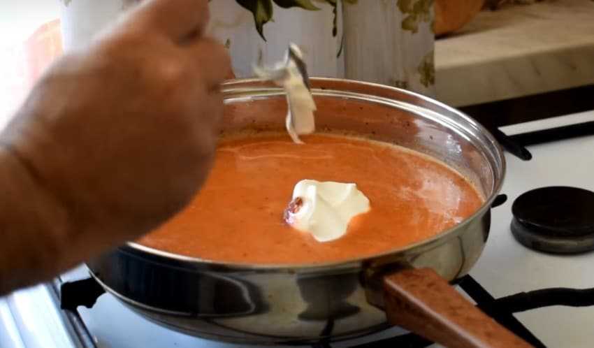 4. Посолите, добавьте свои любимые специи и лавровый лист. Положите сметану. Сделайте огонь чуть меньше среднего.