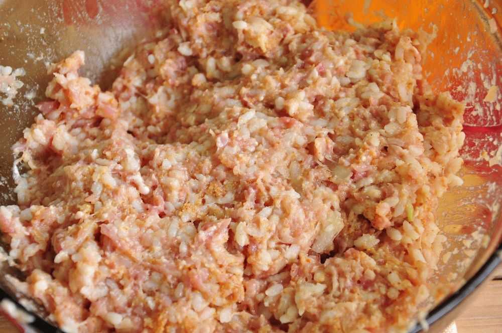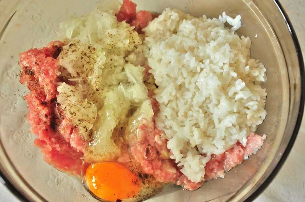1 Фарш соединяем с рисом, яйцом, натертым на крупной терке или пропущенным через мясорубку (блендер) луком, солью и перцем.