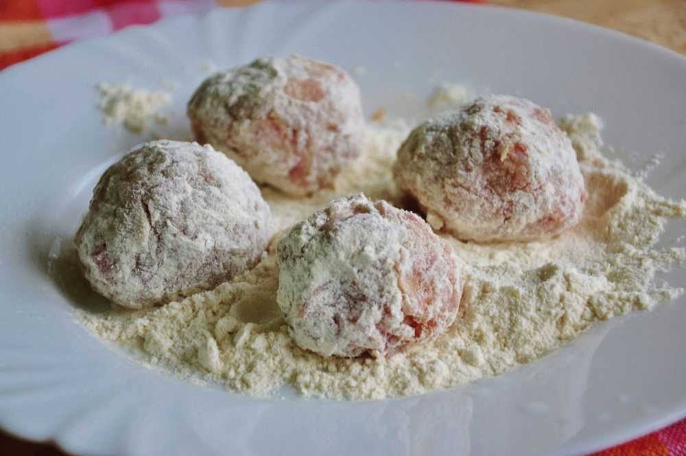 Осталось сформировать наши тефтельки. Чтобы фарш не прилипал к рукам, их следует намочить. Итак, формируем тефтели – круглой формы, небольших размеров. Обваливаем их в муке, чтобы в процессе жарки они не развалились.