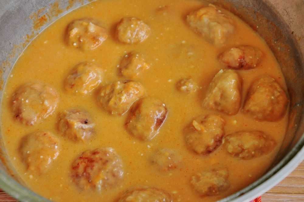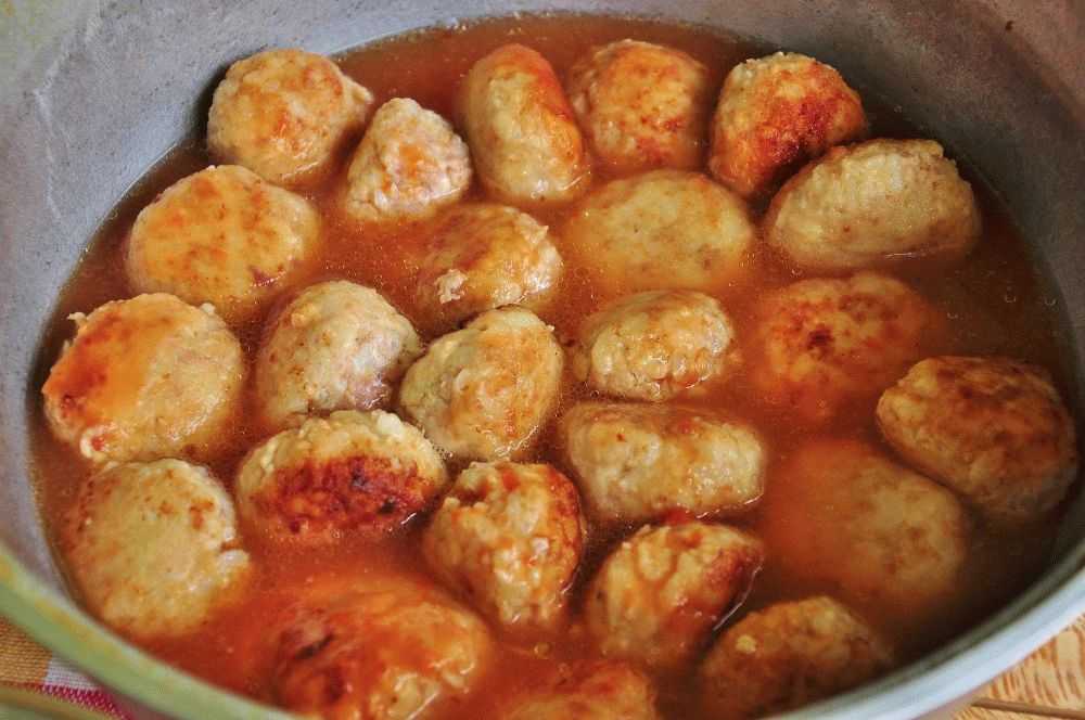 - В жаропрочную емкость выложить обжаренные тефтели. Залить подливкой.