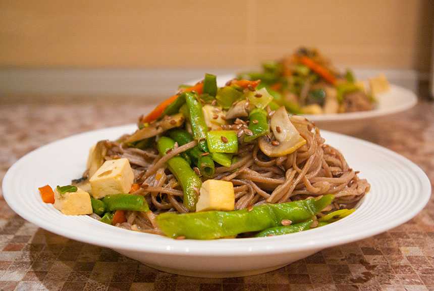В сковороду с луком и чесноком выкладываем тофу (200 г – 300 г) нарезанный квадратиками. Обжариваем и добавляем специи и тимьян. Перемешиваем. Готовность тофу определяется золотистой корочкой, которой сыр покрывается со всех сторон.