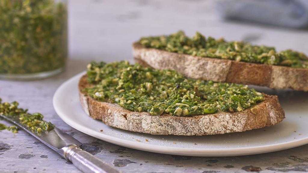 - Немного песто на ломтике пожаренного тоста – очень вкусная и быстрая закуска.