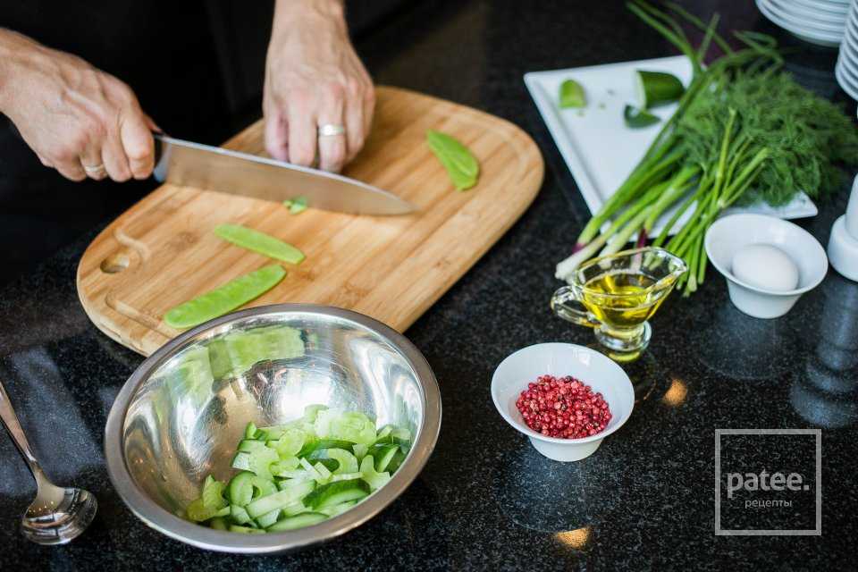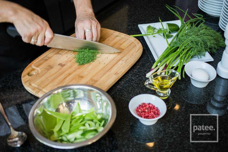 Несколько стручков зеленого горошка моем, проверяем на предмет отсутствия изъянов и режем довольно мелко.