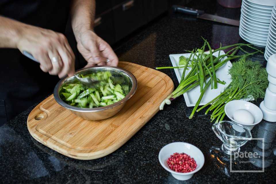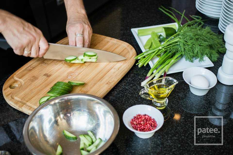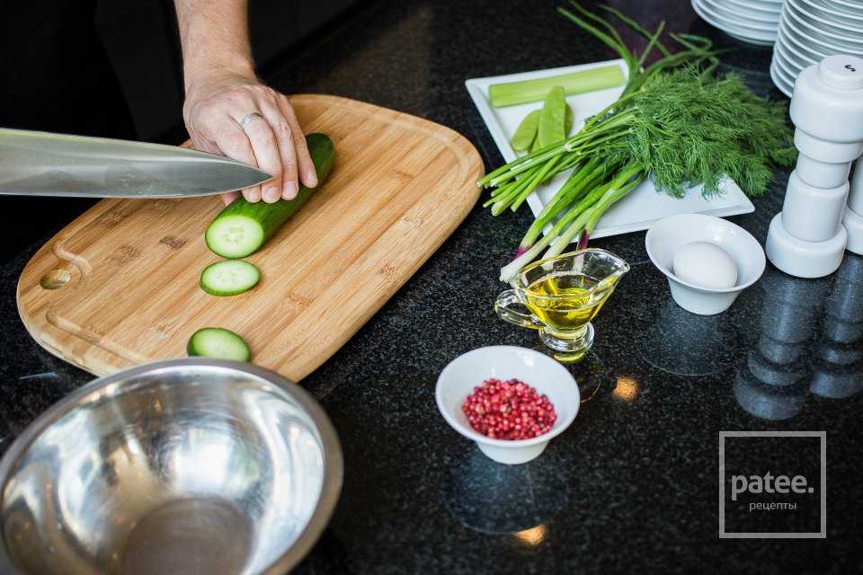 Возьмем один огурец среднего размера, помоем его и проверим, не горчит ли, ведь горький огурец способен испортить наше блюдо.