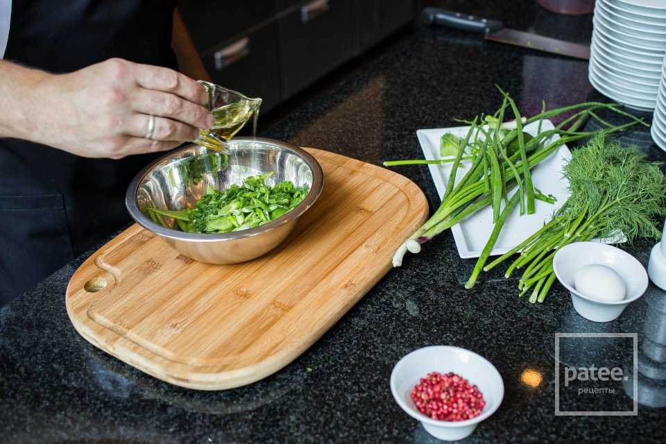 Очень мелко нарезаем небольшое количество свежего укропа и добавляем к нашему будущему салату с яйцом пашот.