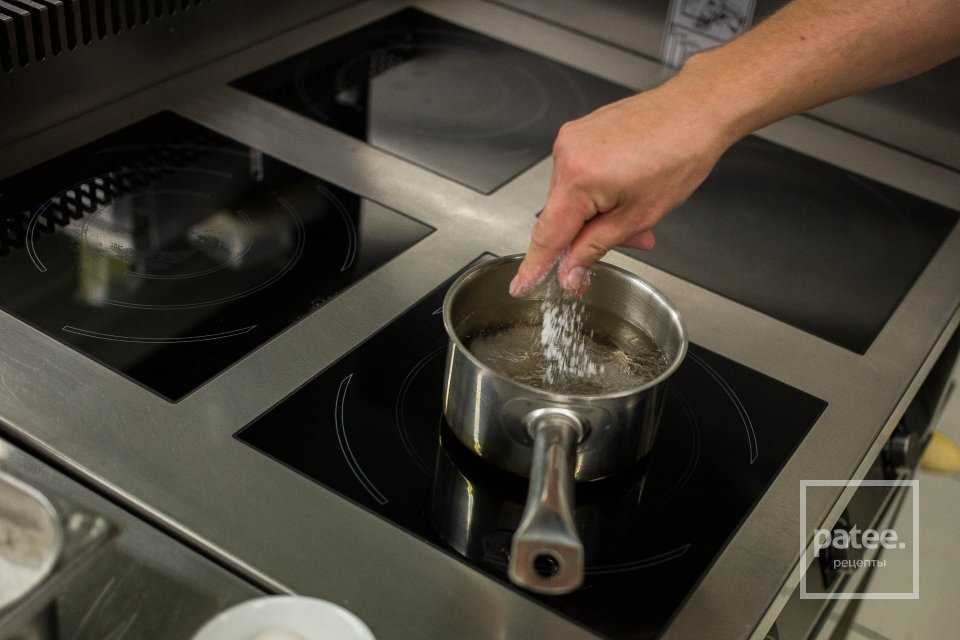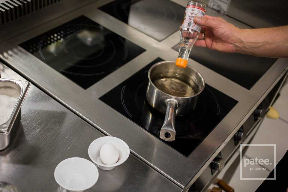 Теперь приступаем к приготовлению яйца пашот. Ставим на плиту воду и добавляем в нее уксус, благодаря которому белок станет крепче, эластичнее и будет лучше удерживать желток. Можно взять яблочный уксус, а можно обычный столовый.