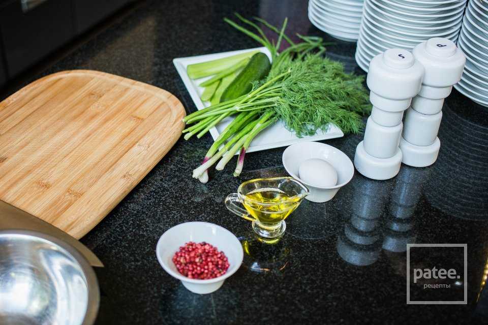 Для приготовления салата с яйцом пашот нам понадобится куриное яйцо, огурец, стебель сельдерея, стручковый горох, укроп, зеленый лук, нерафинированное подсолнечное масло, соль, перец, уксус и для украшения — свежая мята и розовый перец горошком.