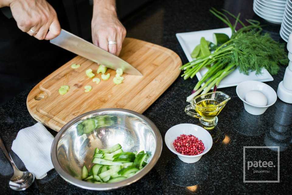 Небольшими брусочками нарезаем несколько стеблей сельдерея, который будет отвечать за ароматную часть салата с яйцом пашот.