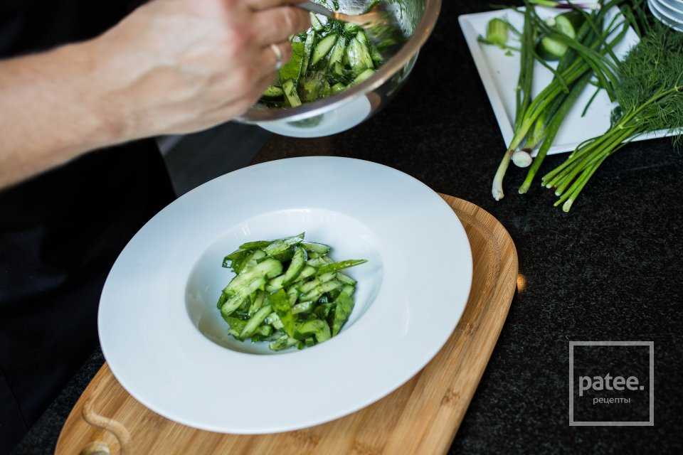 Переходит к оформлению блюда. Выкладываем на тарелку зеленую составляющую салата.