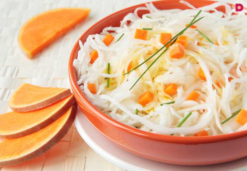 - Натирать морковь предпочтительно на средней терке. Для большей сладости и мягкости квашеной капусты количество моркови можно увеличить.