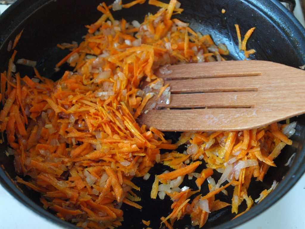 Следует учитывать, что лук гораздо быстрее обжаривается, чем морковь, поэтому в первую очередь следует обжарить морковь и только потом можно добавить лук