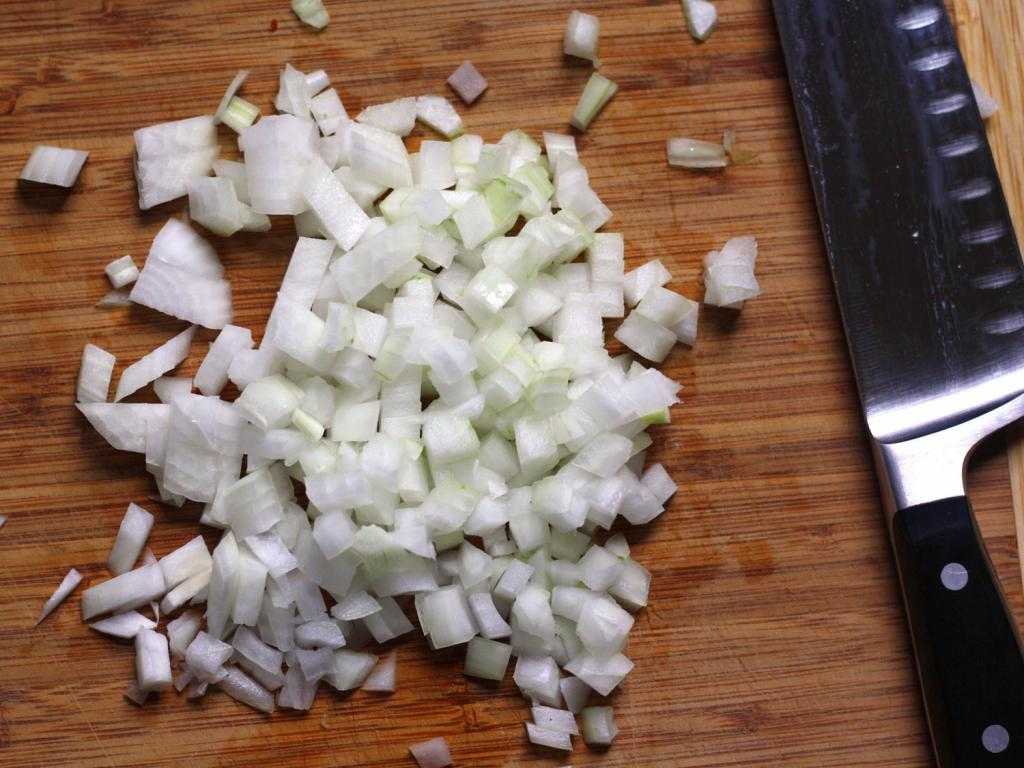 - Лук ошелушить, ополоснуть и измельчить кубиками. Жарить овощ до мягкости в течение 5 минут.