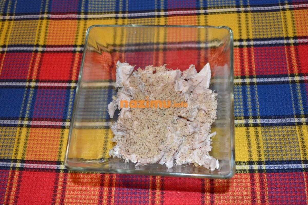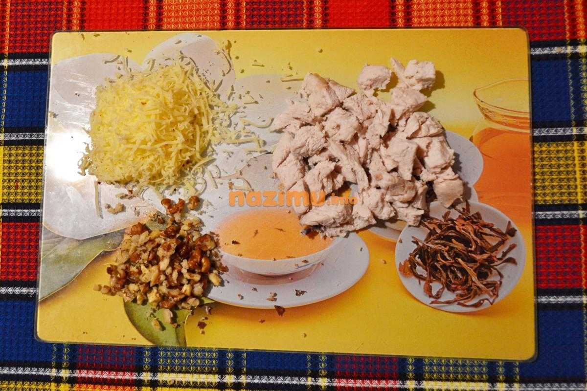 Теперь измельчите продукты: филе нарежьте небольшими кубиками, твердый сыр натрите на терке, орехи очистите от скорлупы и нарежьте маленькими кусочками.