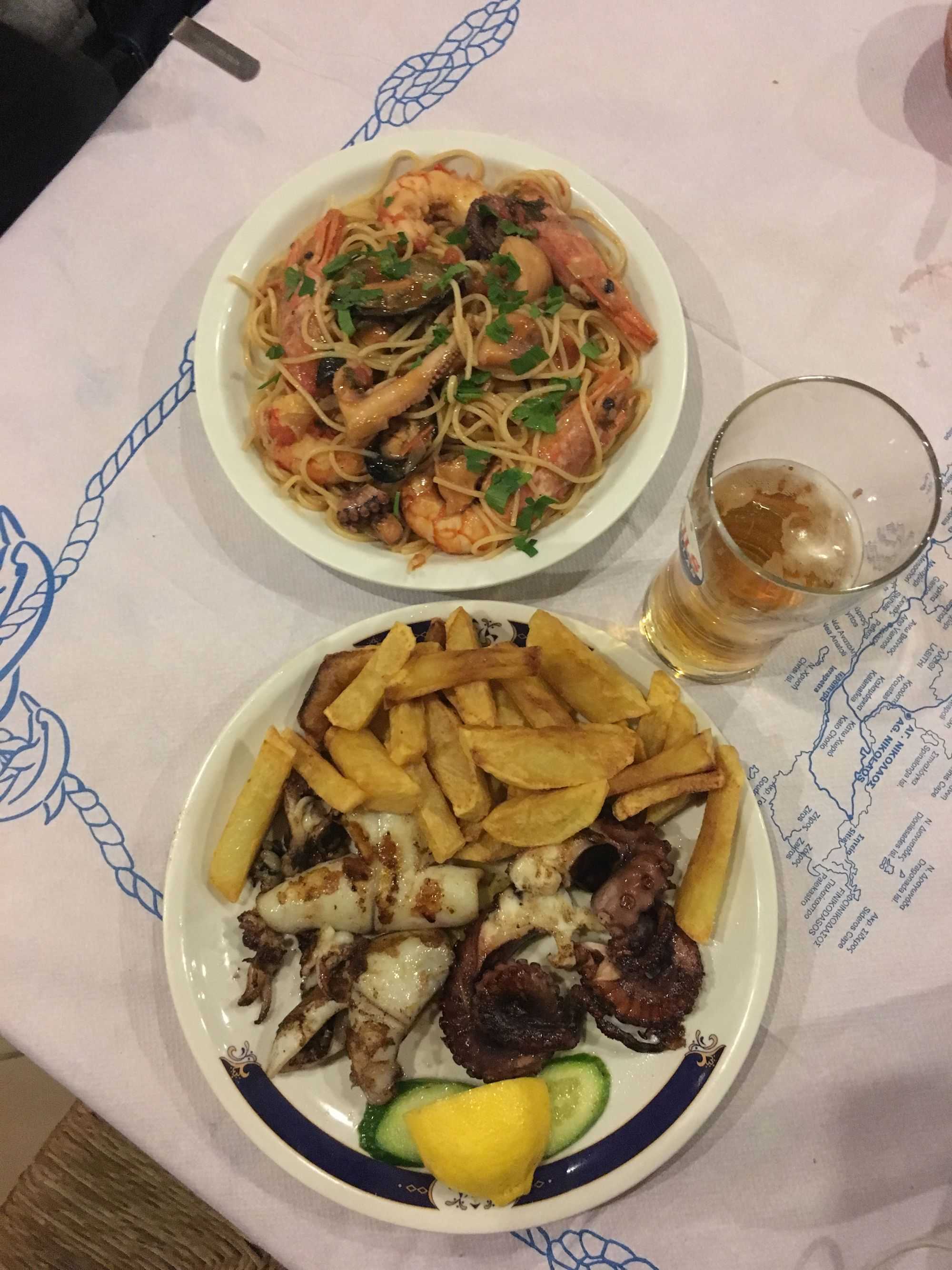 Паста с морепродуктами, осьминог и кальмар в таверне Zorbas, Tsoutsouros