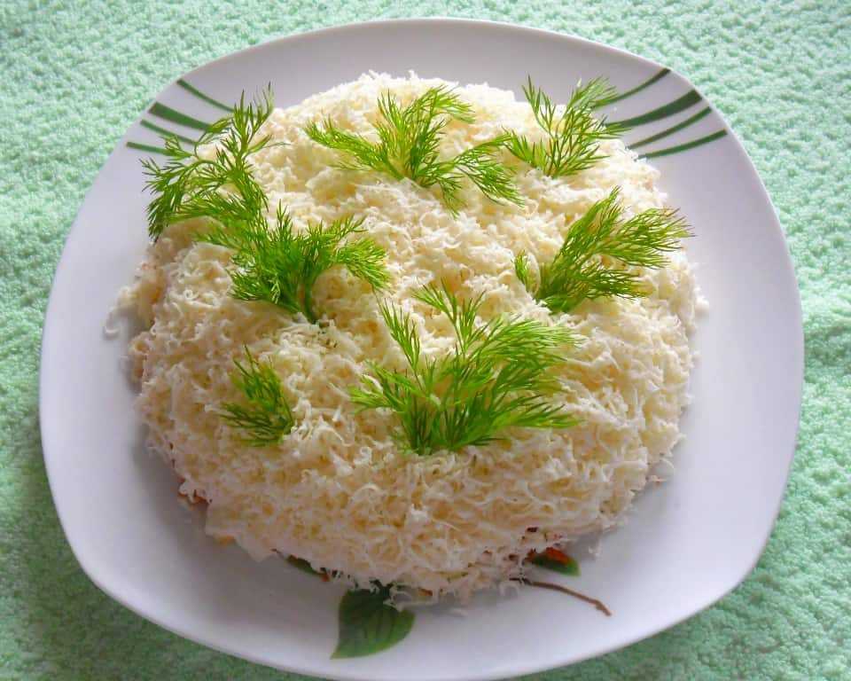 Обратите внимание: каждый слой необходимо смазывать небольшим количеством майонеза, а верхушку салата посыпаем сыром
