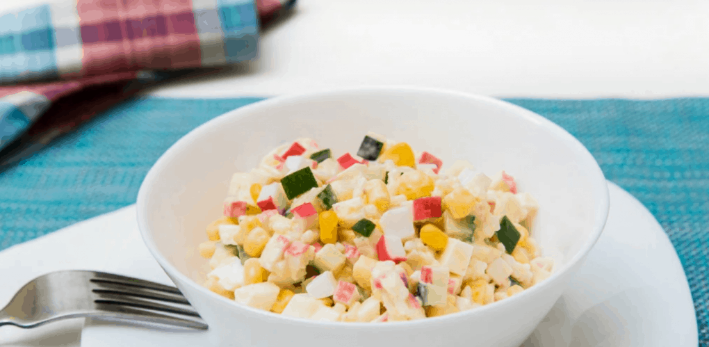 Для создания этого салатика не нужно быть асом кулинарного искусства, ведь самое тяжелое в рецептуре — это открыть банку с консервированной кукурузой. Для этого блюда не требуется поэтапно описывать процесс приготовления, так как вся инструкция состоит из трех простых пунктов.