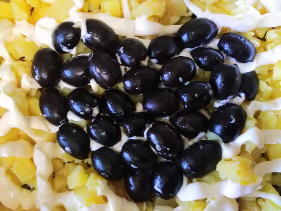 Картофель помоем и отварим минут 20 после кипения до полной готовности. Картофель очистим от мундиров и нарежем на кубики. Смешаем кубики картофеля с майонезом и выложим их четвертым слоем.