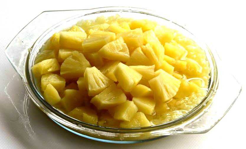 Этап четвертый. Ананасы скинуть на дуршлаг, чтобы стекла жидкость. Нарезать кубиками.