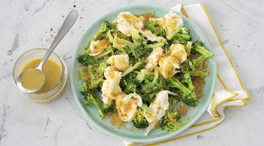 Моцареллу нарежьте дольками или кружочками. По тарелкам разложите брокколи, нарезанную моцареллу, полейте горчичной заправкой, обильно присыпьте хрустящей панировкой и рубленым зеленым луком.