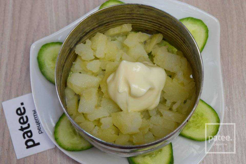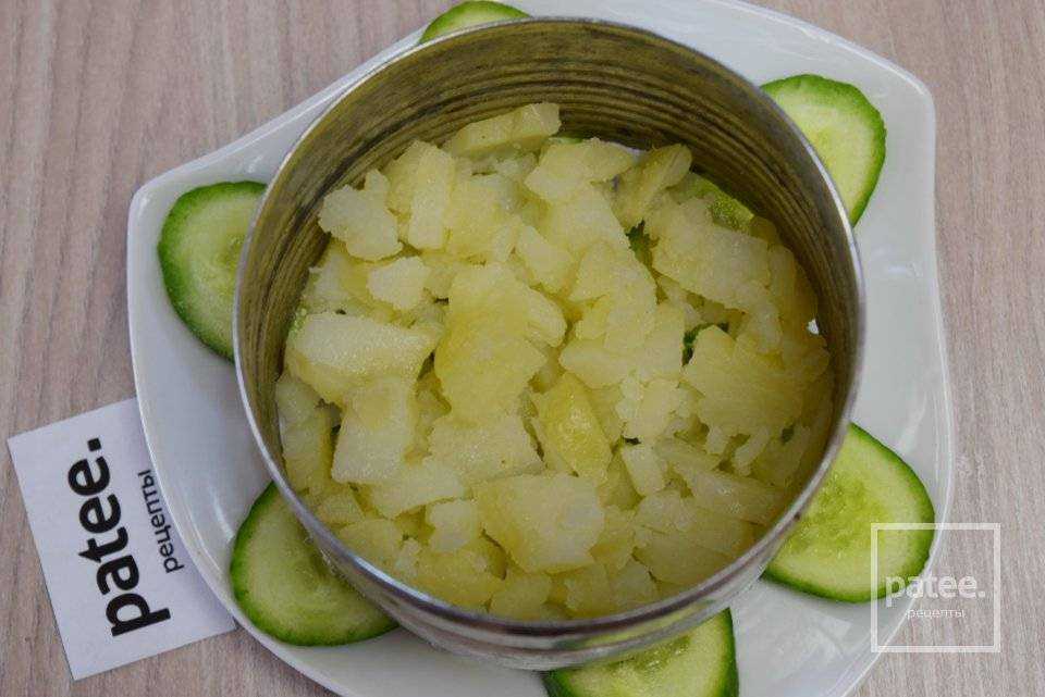 Поскольку я готовлю две порции салата, все указанные в рецепте ингредиенты я буду делить на два при сборке салата. Кружочки огурца выкладываем на тарелку по кругу. Сверху устанавливаем кольцо. В него выкладываем картофель.