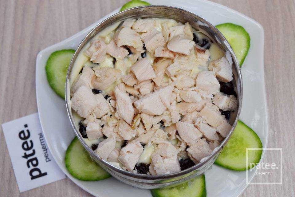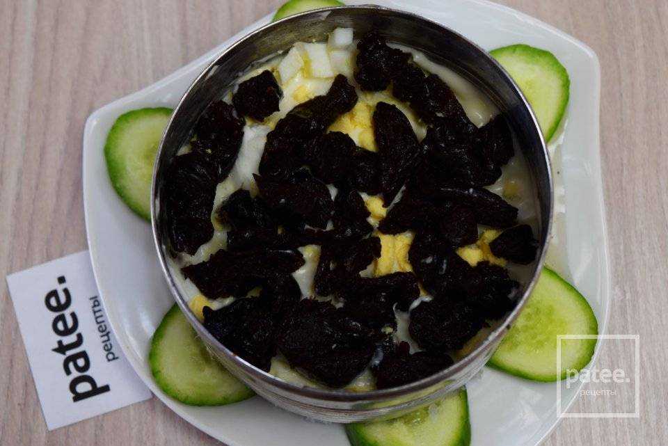 Выкладываем чернослив к остальным ингредиентам. Промазываем слой майонезом.