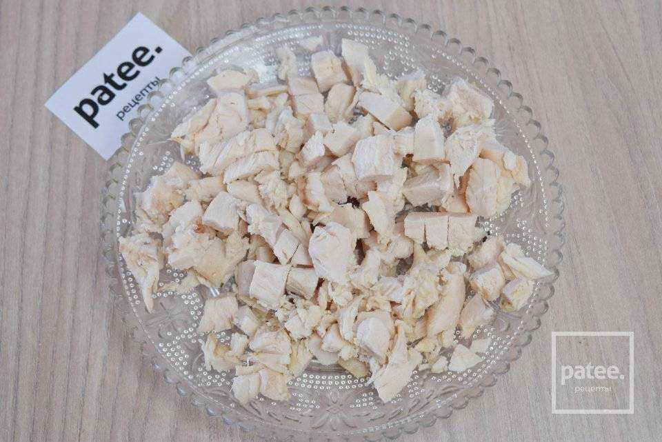 Куриное филе отвариваем в подсоленой воде до готовности в течении 20 минут. Даем ему остыть и нарезаем филе мелким кубиком.