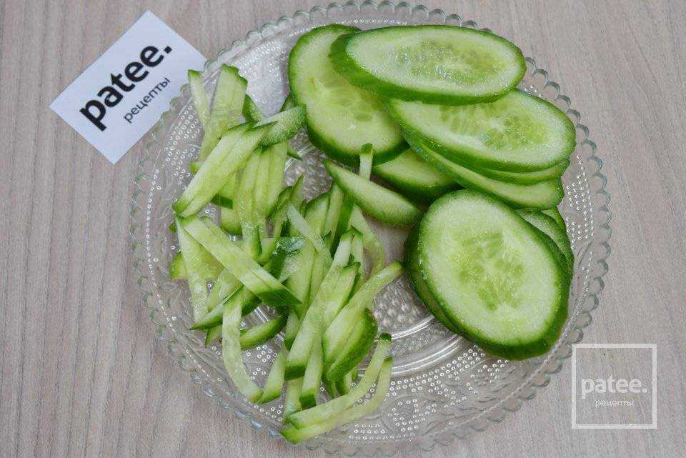 Свежий огурец моем. Половину огурца нарезаем кружочками, вторую половину огурца нарезаем соломкой.