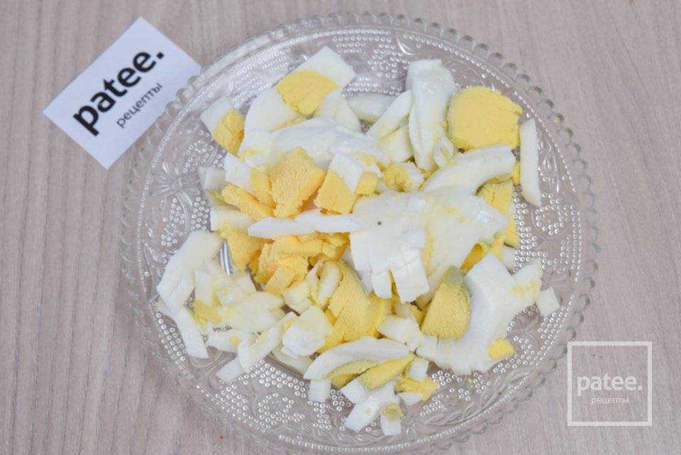 Яйца отвариваем вкрутую. Очищаем и нарезаем их мелким кубиком.