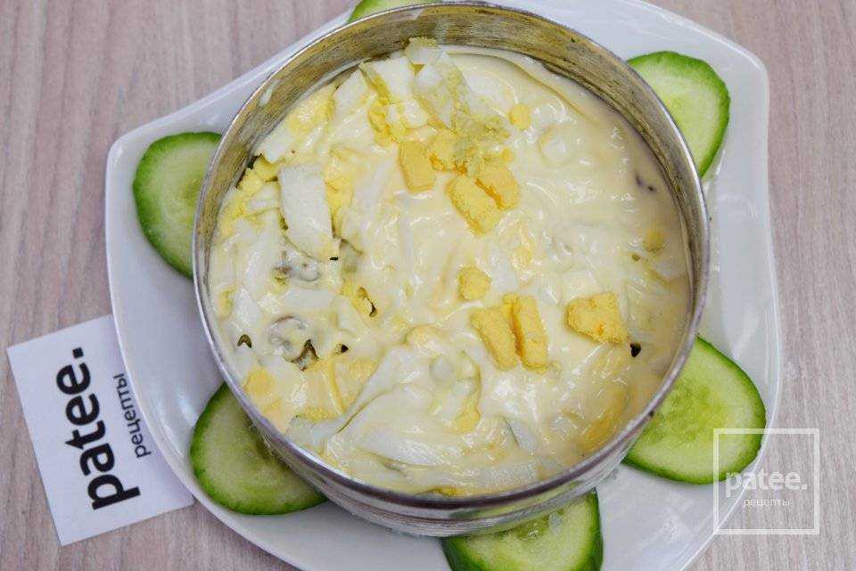 Делаем следующий слой салата из яиц. Промазываем слой майонезом.