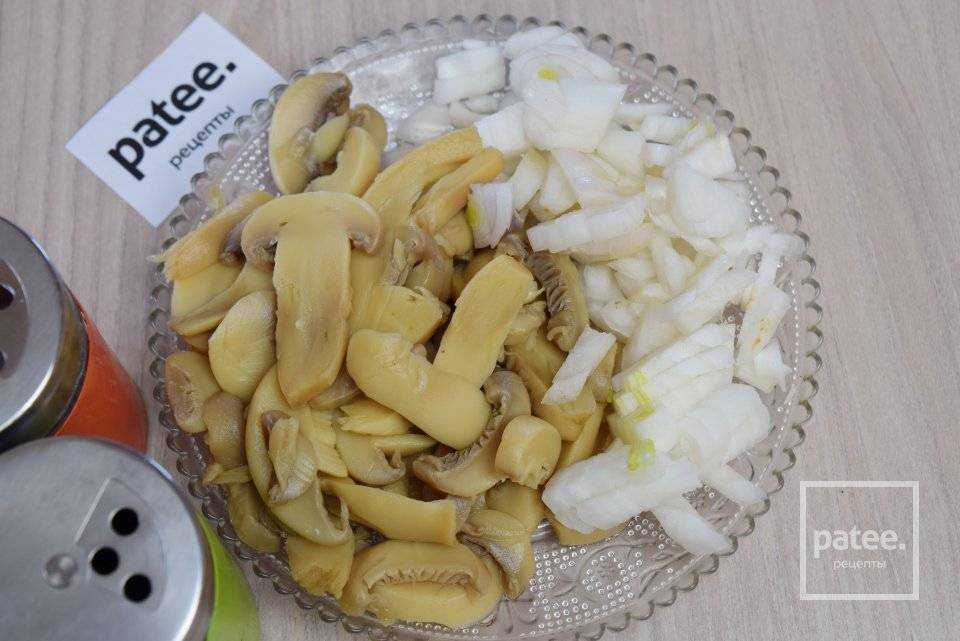 Этап 2. Тонкими пластинками порезать 300 грамм свежих шампиньонов и поджарить их на растительном масле с одной нашинкованной луковицей и одним зубчиком чеснока (мелко порезать);