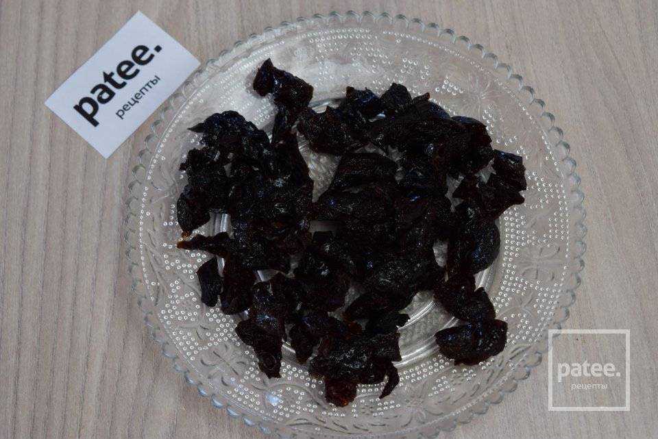 Чернослив нарезаем мелким кубиком. Если у вас чернослив твердый, лучше его предварительно замочить в теплой воде.