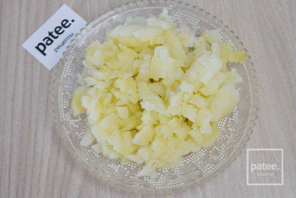 Картофель в кожуре отвариваем в подсоленой воде. Остужаем, очищаем от кожуры и нарезаем мелким кубиком.