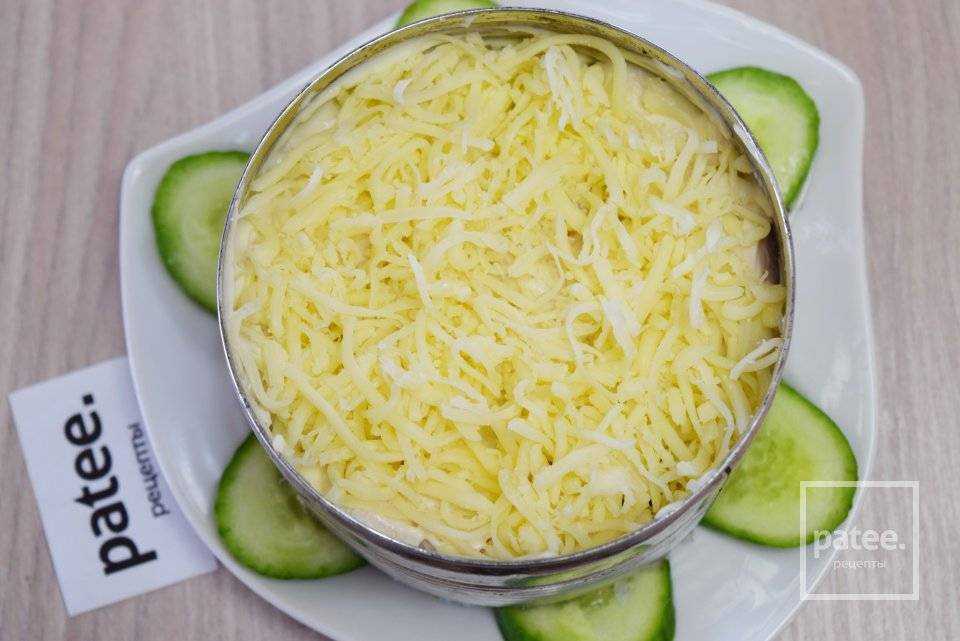 - чтобы салат не растекался по блюду возьмите разъемную форму без дна, смажьте бортики растительным маслом. Положите форму на блюдо и выкладывайте слои;