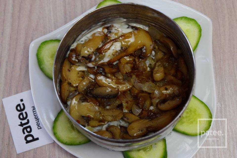 - Шампиньончики переберем, помоем и почистим немного. Потом нарежем крупными ломтиками. В то же время поставим греться сковороду, добавим в нее сметаны, немного воды, а затем высыпаем грибочки. Тушим все до готовности, пока смесь сметаны и воды не испарится. Перед выкладыванием в угощение шампиньоны обязательно нужно остудить;