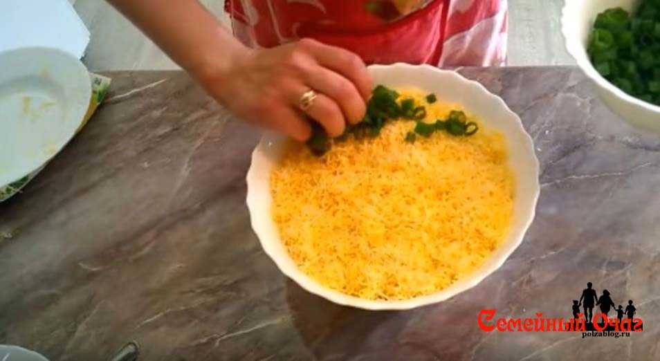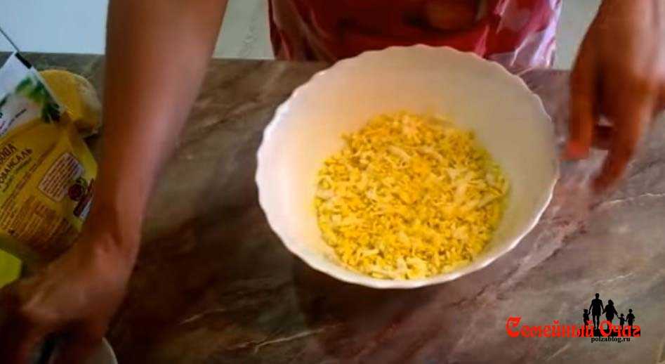 Первым делом отвариваем яйца. Измельчаем их или трем и выкладываем первым рядом с майонезом.